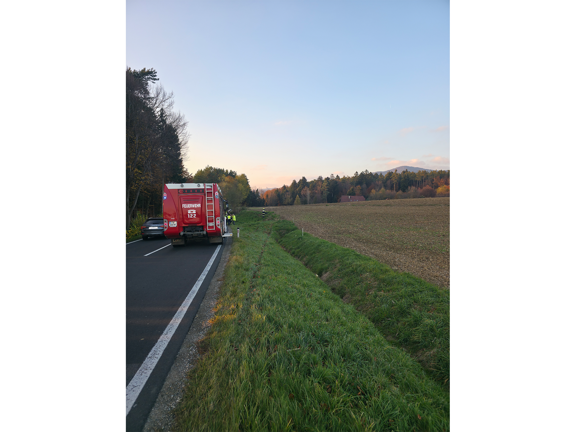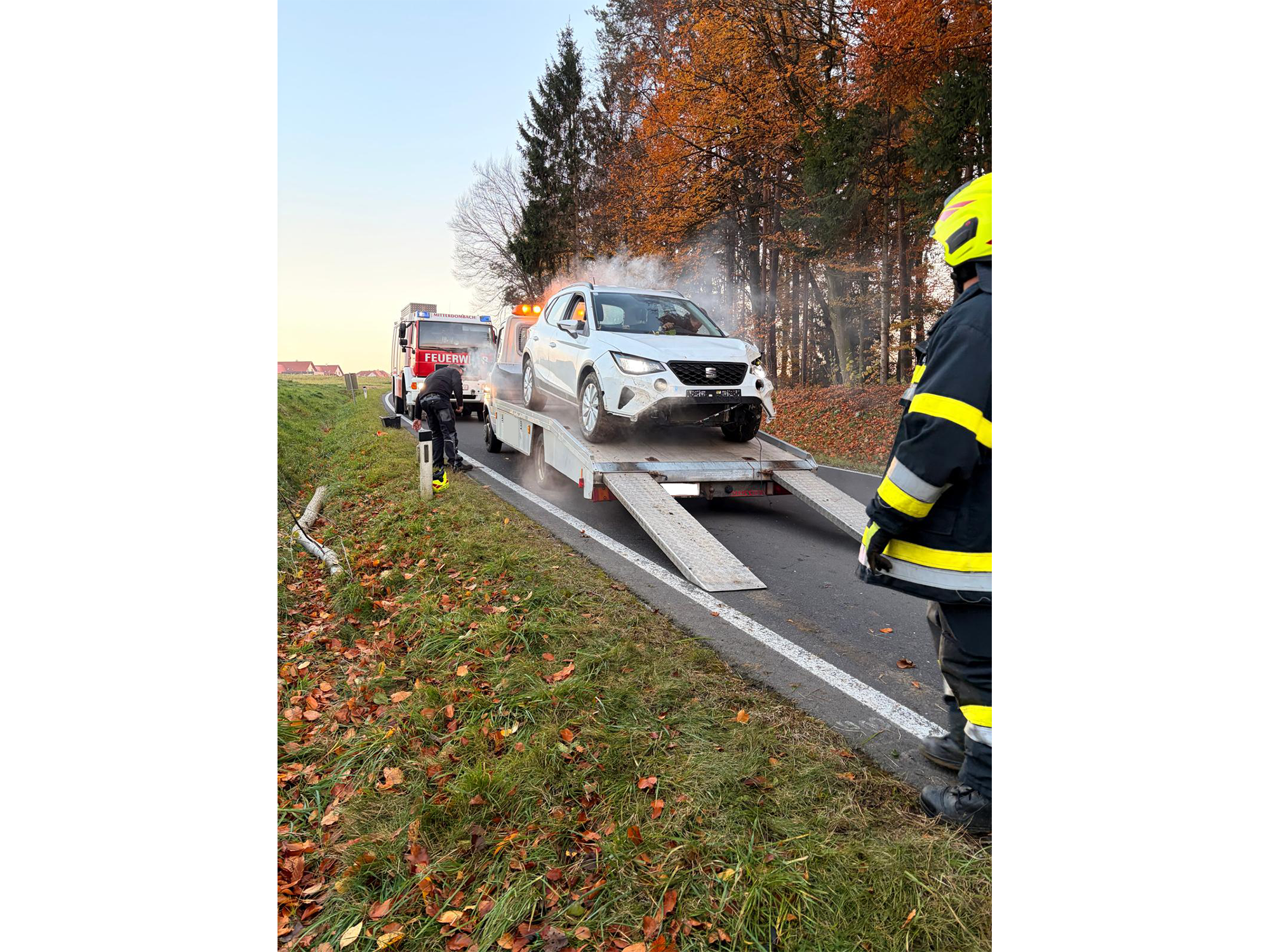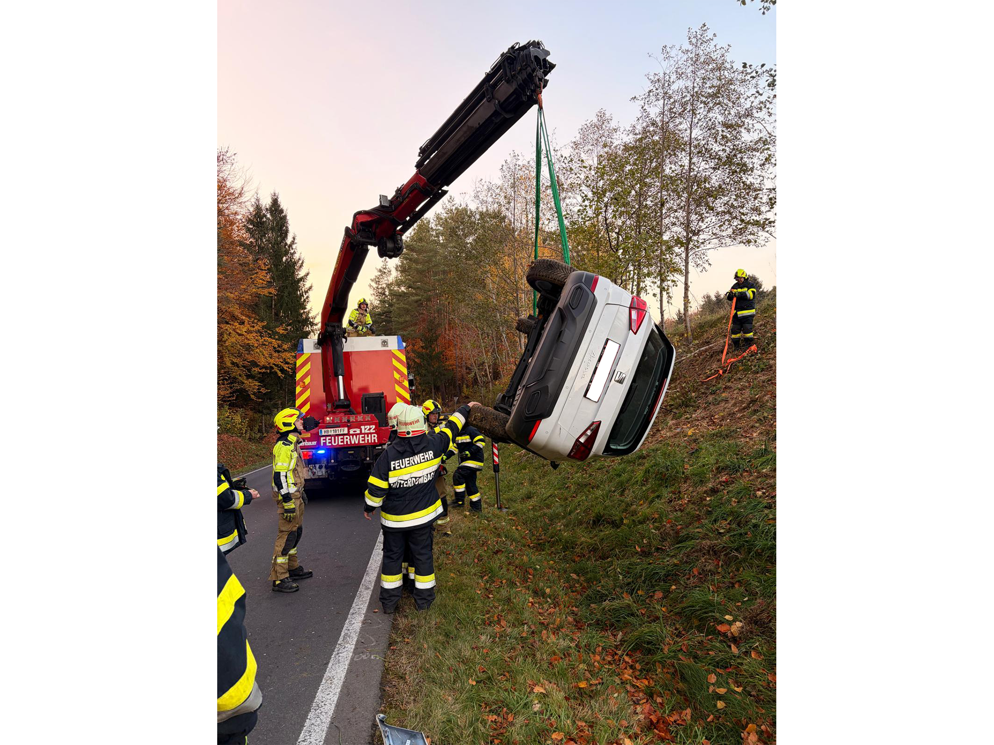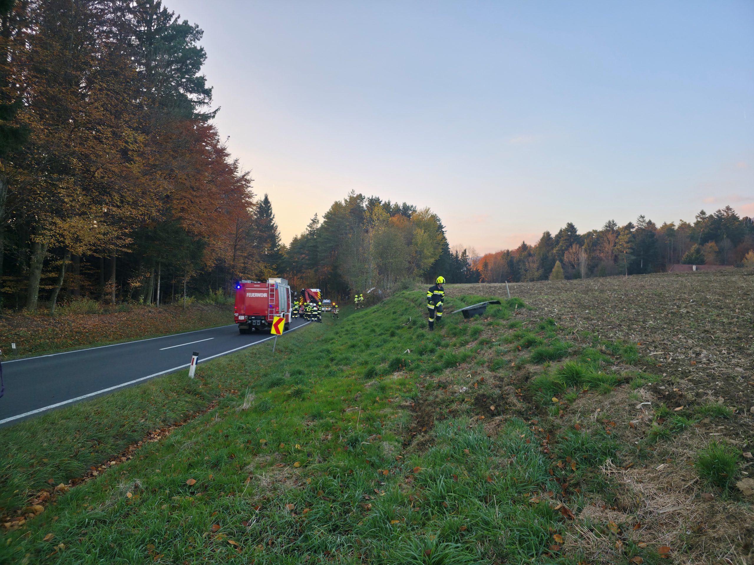 Am Donnerstag, dem 6. November 2025, wurde die FF Schildbach gemeinsam mit der FF Mitterdombach um 15:40 Uhr zu einer Fahrzeugbergung auf L406 nahe Flattendorf gerufen. Ein Auto war von der Straße abgekommen und nach etwa 50 Metern zwischen Bäumen zum Stehen gekommen.