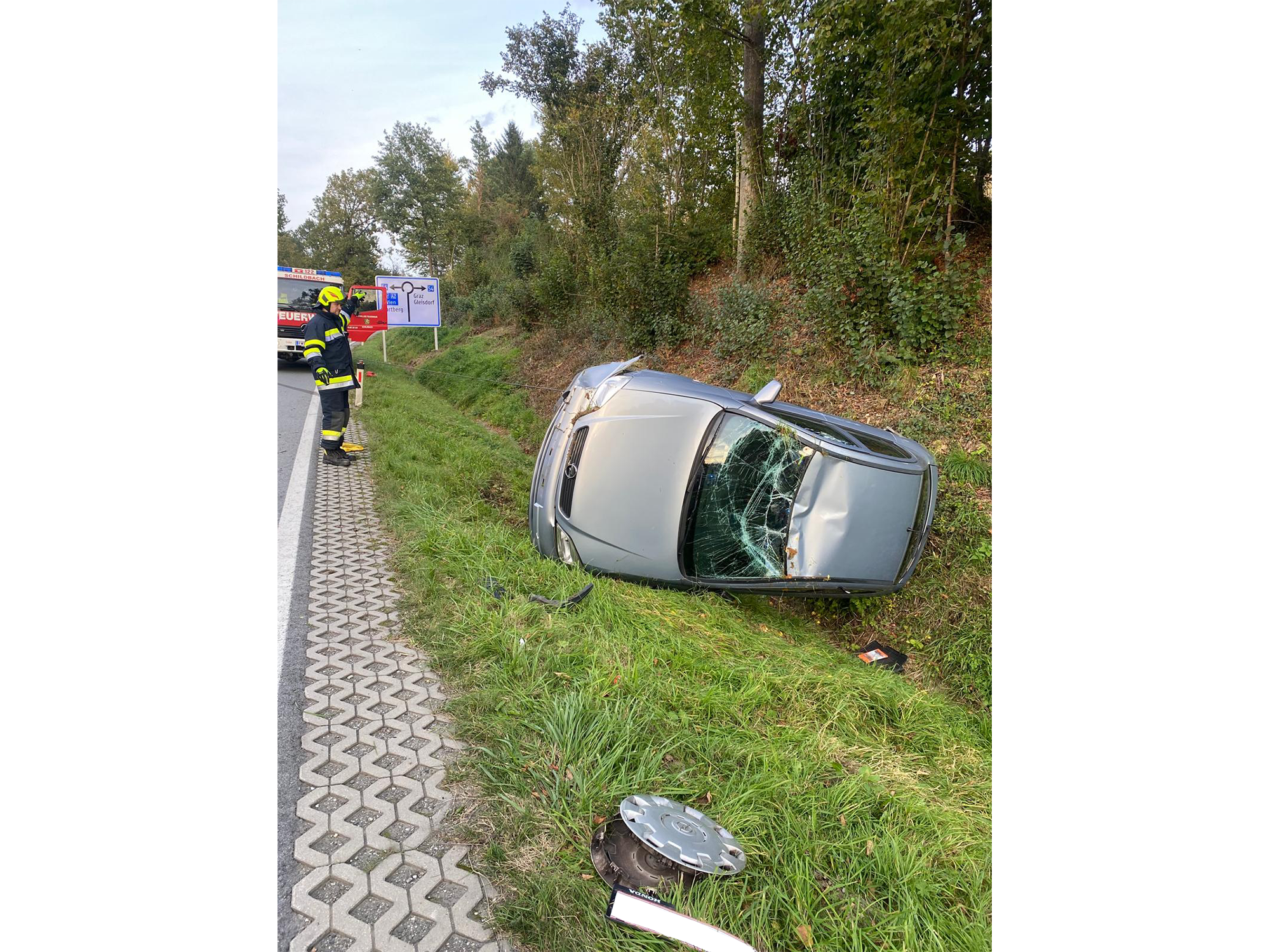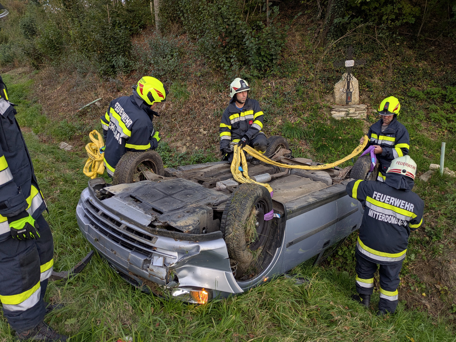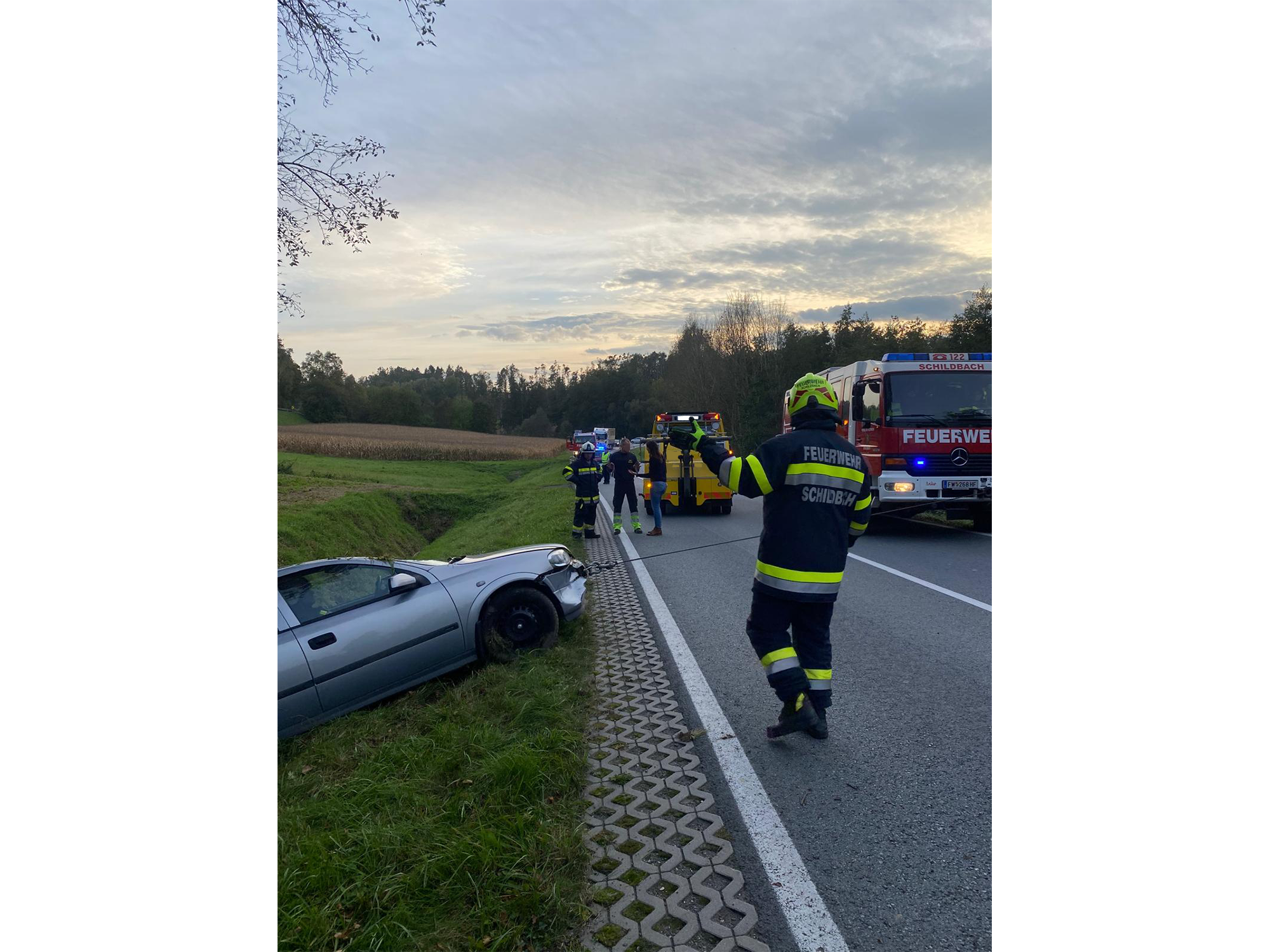 Am Mittwoch, dem 8. Oktober 2025, wurde die FF Schildbach gemeinsam mit der FF Mitterdombach um 17:05 Uhr zu einer Fahrzeugbergung auf der L406 Schloffereckstraße gerufen. Ein Auto war von der Straße abgekommen und auf dem Dach im Graben zum Liegen gekommen.