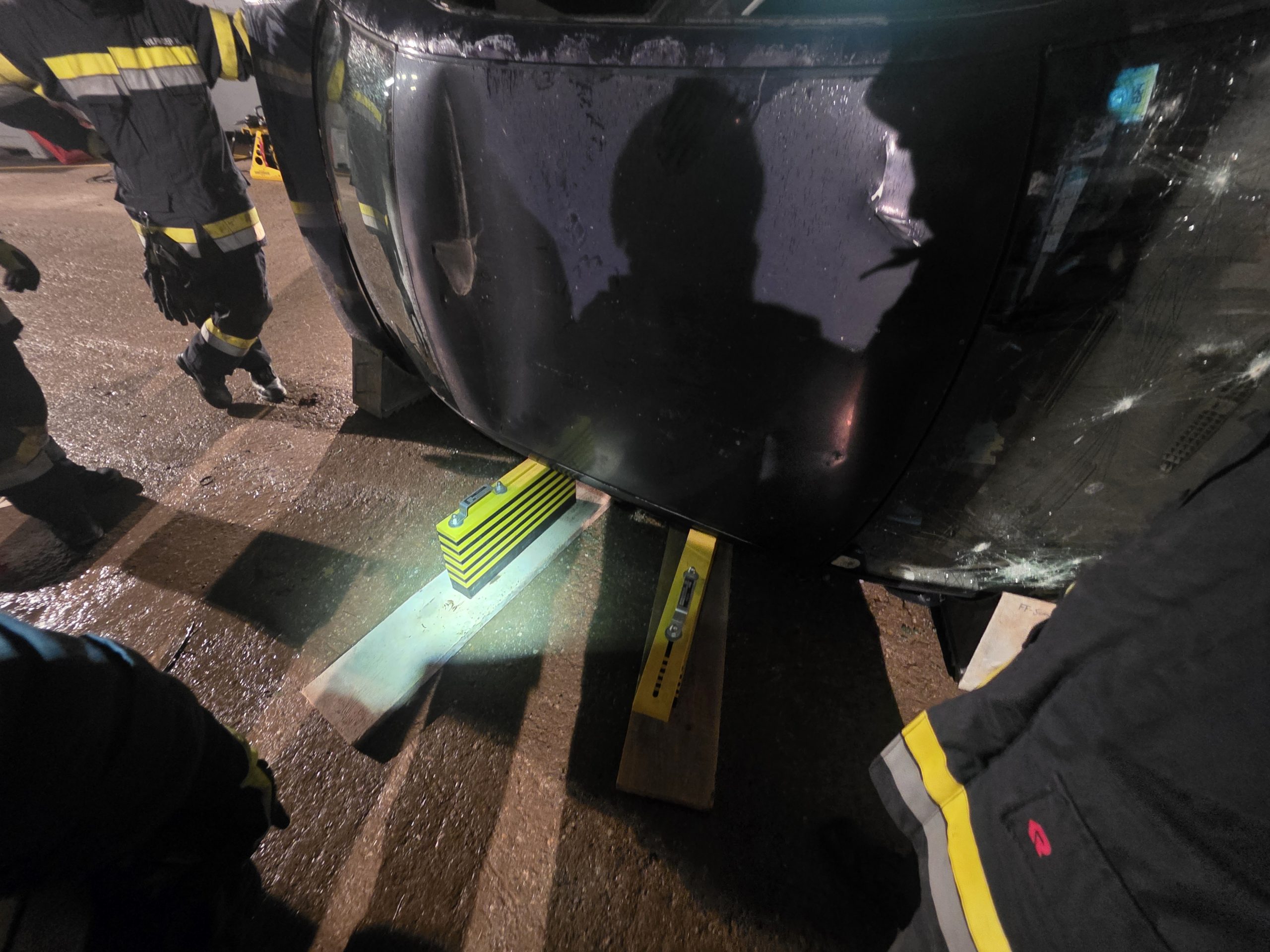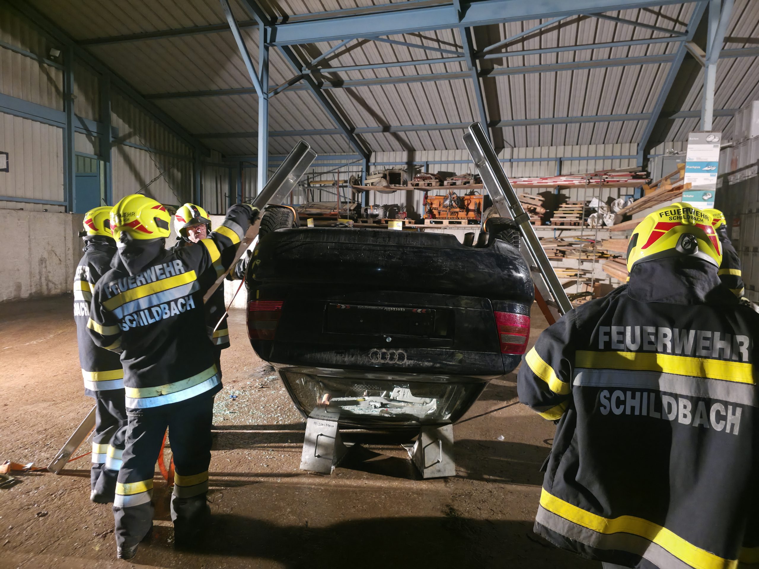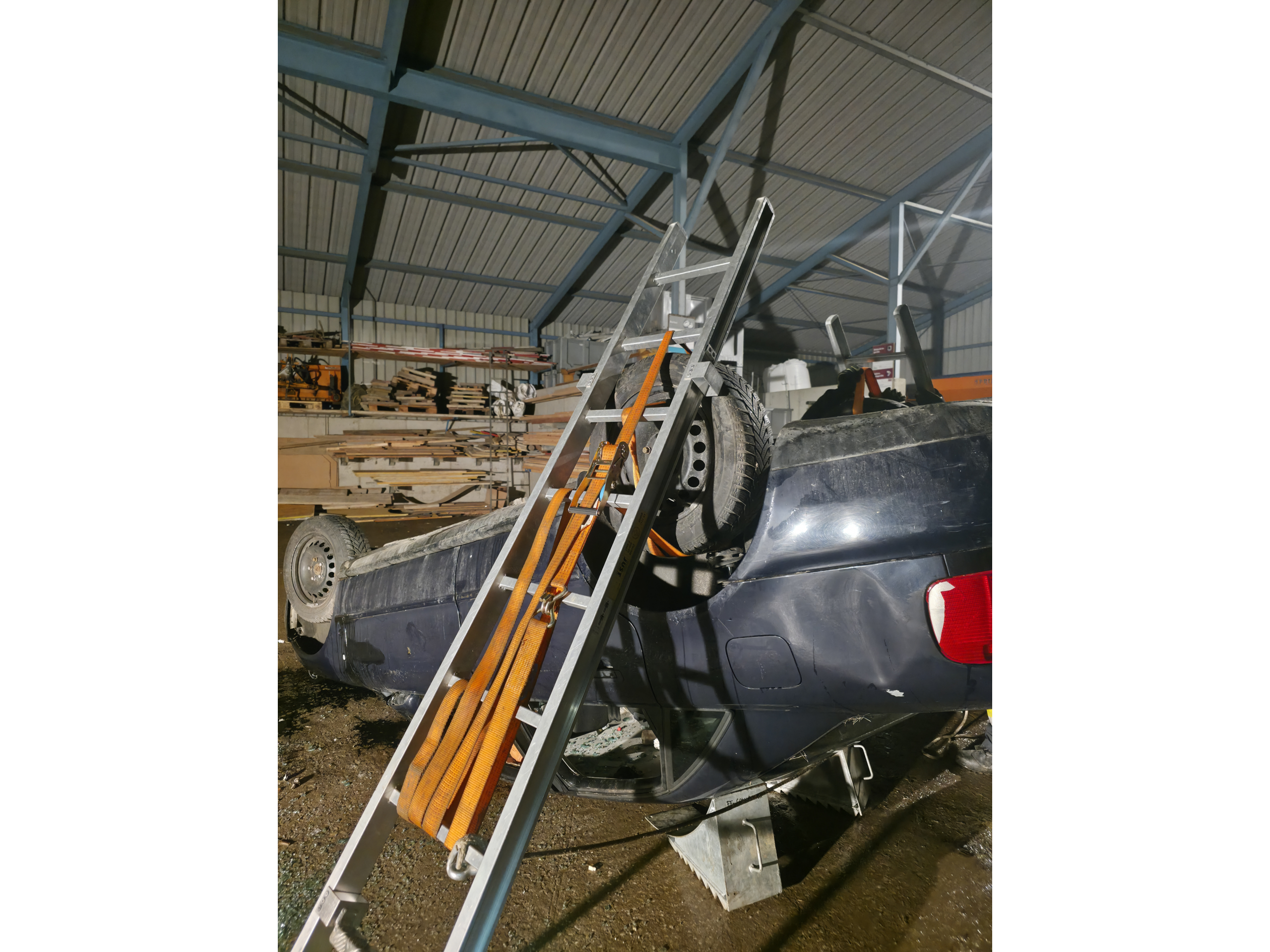 - Stabilisieren des Fahrzeugs mithilfe von Keilen, Blöcken und Leitern in Seiten- und Dachlage
